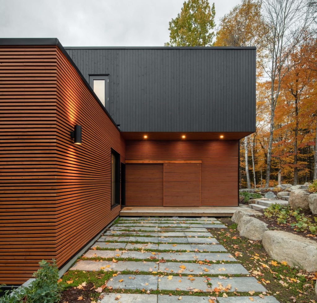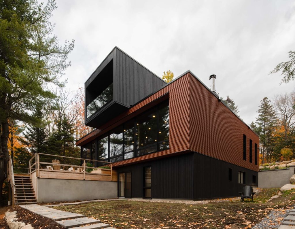 Suite à l’achat d’une humble maison de campagne il y a 25 ans, les propriétaires ont voulu s’offrir une nouvelle résidence secondaire où l’espace accueillerait confortablement tous les nouveaux membres de leur famille. Surplombant le lac Manitou à Ivry-sur-le-Lac, au Québec, la maison, conçue par l’architecte canadien Richard Rubin du collectif Figurr Architects, est composée de cinq modules construits en usine, chacun d’une longueur d’environ cinquante pieds, qui ont été construits avant d’être expédiés vers leur destination finale. Conçu dans le but de créer une empreinte environnementale extrêmement faible, l’architecte propriétaire est en train de demander une certification LEED Or pour sa maison.