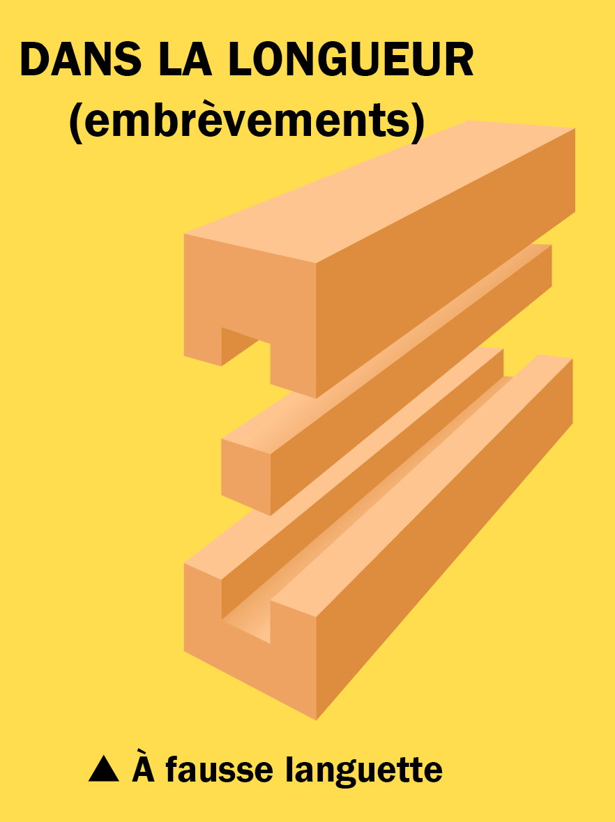 - Assemblages dans la longueur, appelés “embrèvements”, pour constituer un panneau avec des planches, et pour encastrer un panneau dans un châssis ou un cadre.