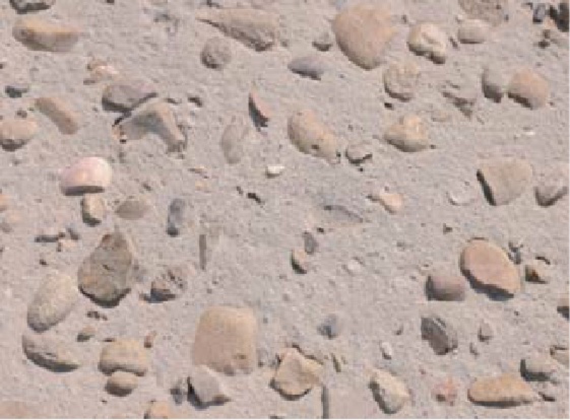 Les granulats diffèrent par leur taille, leur couleur, leur forme et participent d’autant à la définition du matériau : finesse du revêtement, couleur, réverbération, rugosité… Tous les granulats ne supportent pas les mêmes usages. Les roulés apportent de l’éclat et de la glissance au revêtement contrairement aux concassés. Les granulats silico-calcaires ont des résistances mécaniques moindres que les granulats granitiques mais ont des teintes différentes. La dureté des granulats devra être d’autant plus importante que la circulation véhicules légers sera fréquente. Leur provenance peut être variée mais elle entraînera dès lors des difficultés de gestion. Leur taille, leur caractéristique roulé ou concassé peuvent rendre l’usage du revêtement moins confortable : que ce soit pour les personnes à mobilité réduite en premier lieu ou pour les piétons et vélos. Les bétons sont dits cyclopéens lorsqu’ils sont constitués de granulats de diamètre de plus de 20 mm.