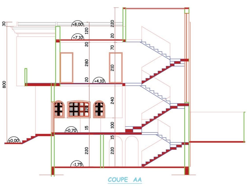 Le plan est constitué d’un sous-sol + RDC + Étage.