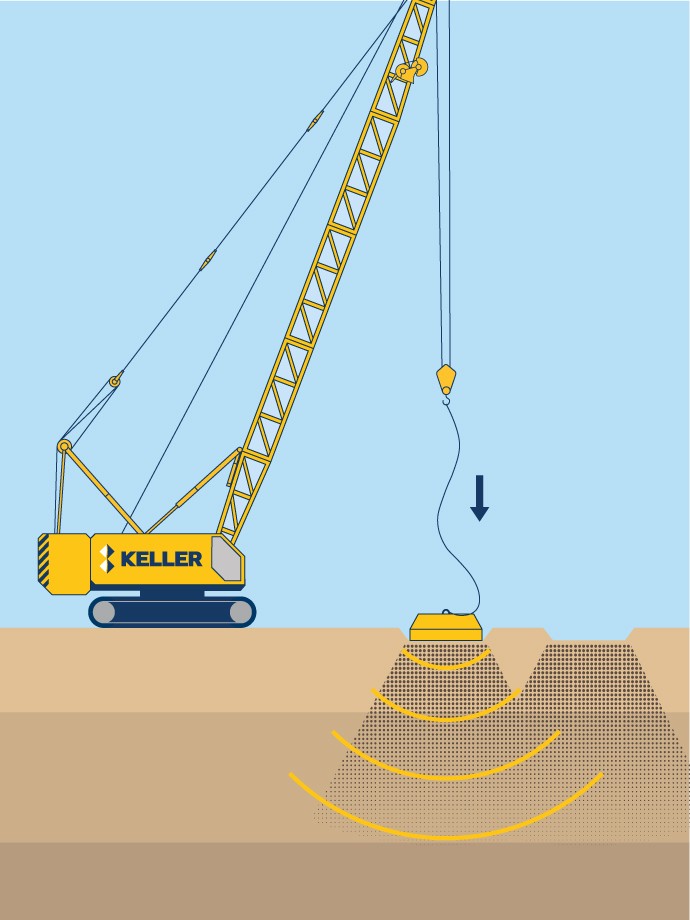 Elle est lâchée plusieurs fois sur un quadrillage qui recouvre le site pour réaliser une première passe. Deux ou trois passes de compactage peuvent ensuite être nécessaires par site, selon le type et l’état du sol. Les empreintes formées après chaque passage de compactage sont remplies de matériau granulaire..