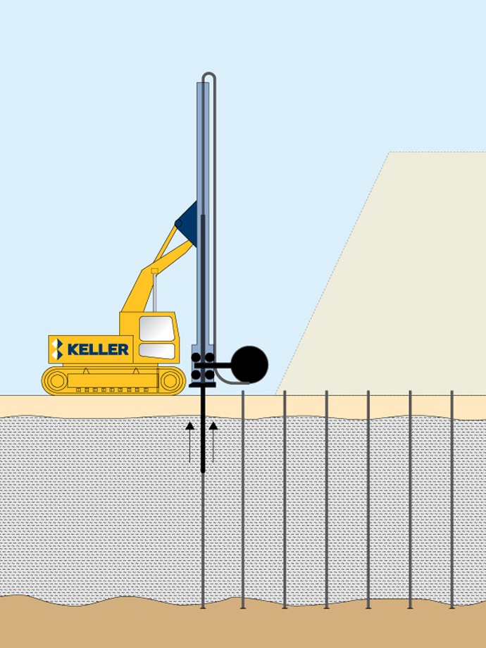 Les drains plats qui sont les plus utilisés sont constitués d’une bande préfabriquée idéale pour l’écoulement de l’eau. Le noyau flexible est généralement fabriqué en polypropylène et les deux côtés ont des rainures permettant à l’eau de s’écouler sans entrave. Le noyau est enveloppé dans un tissu filtrant géotextile solide et durable avec d’excellentes propriétés de transitivité, permettant un accès libre de l’eau interstitielle dans le drain. Cela empêche également de pomper des fines particules provenant des sols adjacents sans colmatage. Le drain est amené à travers un mandrin creux monté sur une pelle ou un mât de grue, relié au fond à une plaque perdue. Un vibro-fonceur ou une méthode statique est utilisé pour insérer le mandrin à la profondeur requise. Il est ensuite retiré, laissant le drain plat en place. Le drain est ensuite découpé à la surface du sol, une nouvelle plaque perdue y est fixée et le mandrin est déplacé vers le point suivant. Le maillage de drains verticaux réalisé permet de drainer les eaux interstitielles, ce qui accélère le processus de consolidation et les délais de construction.