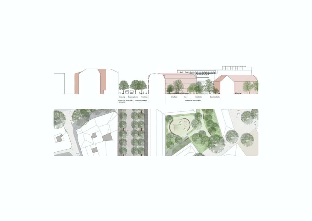 Notre proposition met en évidence l’axe Schillerplatz-Mainzer Dom et la promenade de la Ludwigstrasse (familièrement appelée « LU »), en redessinant à la fois les façades des rues et les places. Environ 5 000 m² d’espaces verts ont été ajoutés, notamment des jardins, un amphithéâtre directement relié à la Ludwigstrasse et une nouvelle place publique reliant commerces, hôtels et restaurants. Notre proposition limite également la circulation automobile sur l’axe Schillerplatz-Catedral aux transports publics et aux véhicules d’urgence, augmentant ainsi la durabilité de la ville grâce à l’accessibilité des piétons et des vélos, ce qui renforce à son tour le commerce de rue.